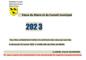 Le Maire et le Conseil Municipal vous invite le dimanche 22 Janvier à 11h00 à la salle des fêtes pour la présentation des vœux 2023.