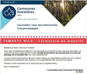 Je vous prie de bien vouloir trouver ci-joint l’arrêté n° 032-2026-02-13-00003 du 13 février 2026 portant fermeture de l’ensemble des massifs forestiers du département du Gers.